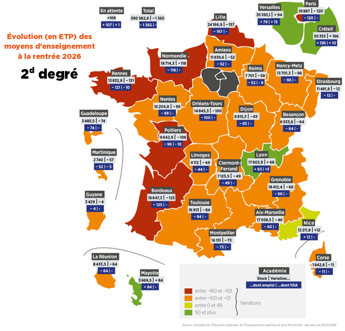 Comme toujours ces dernières années et encore pour quelques années, les dynamiques démographiques internes à notre académie, métropolisation et déprise rurale, suscitent des créations d’établissement, mais à effectifs constants. Or le Ministère dote les académies en fonction des effectifs, pas du nombre d’établissements. Créer des établissements supposent donc des redéploiements, de supprimer des postes ailleurs, là où les effectifs diminuent parfois, mais pas forcément au point de justifier ces suppressions ;