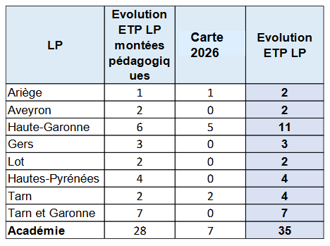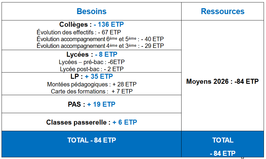 créations de 35 postes pour accompagner les créations de filières professionnelles, ce qui, pour maintenir l’objectif de 84 postes supprimés, suscite 136 suppressions d’ETP en collège et 8 en LGT